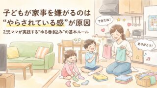 子どもが家事を手伝わない…と悩むママへ。2児在宅ママが実践する“ゆる家事巻き込み術”を紹介。遊び感覚で自然と参加したくなる工夫をまとめました。