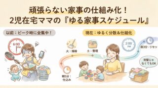 家事が回らない…と悩むママへ。無理をしない“ゆる家事スケジュール”で毎日がラクになる仕組みを紹介。2児在宅ママの実例つきでわかりやすく解説します。