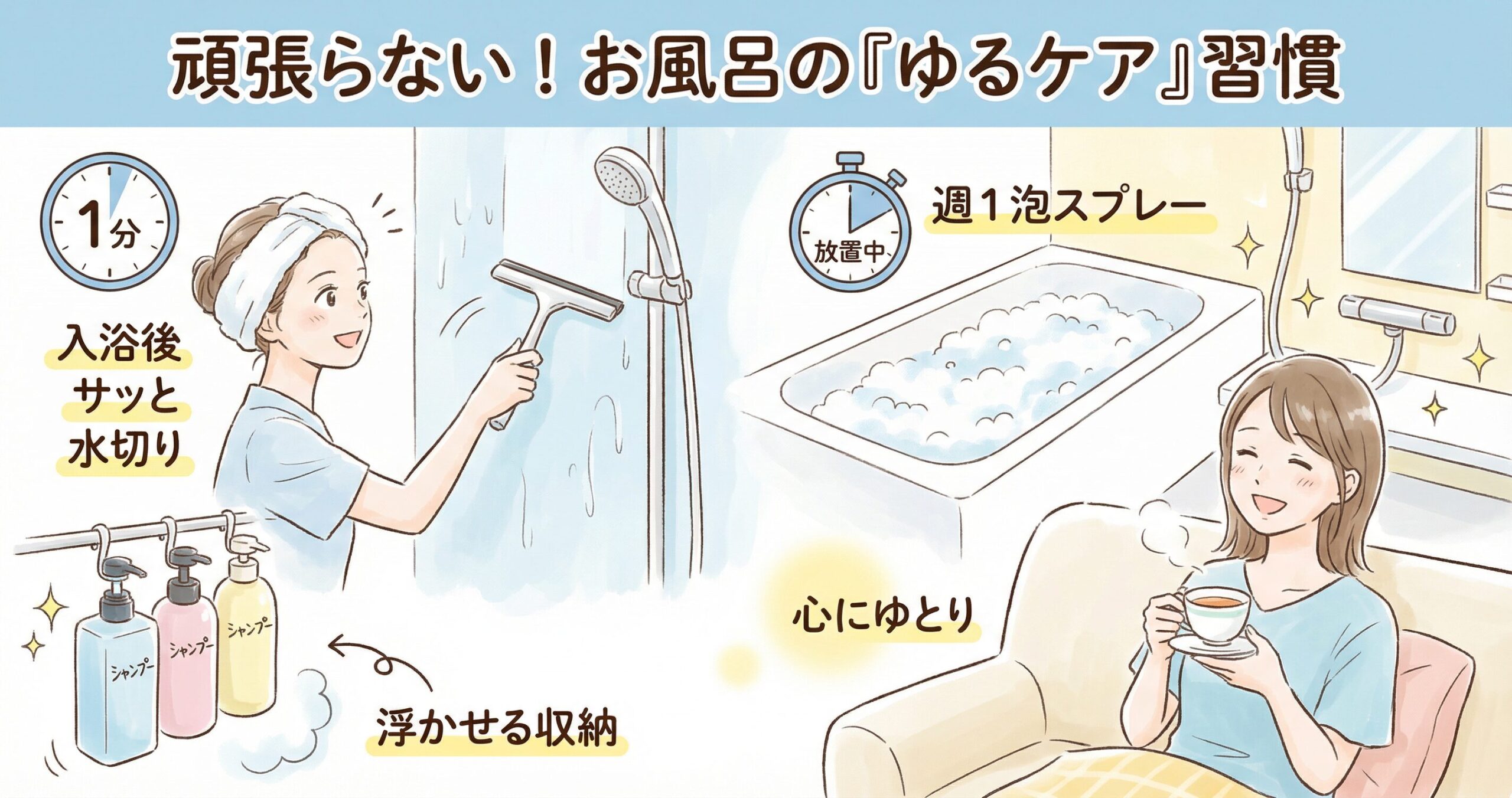 お風呂掃除が負担に感じていた方こそ、今日からぜひゆるケア習慣を取り入れてみてください。生活がぐっと軽くなり、「お風呂掃除ってこんなに楽だったんだ」と感じられるはずです。