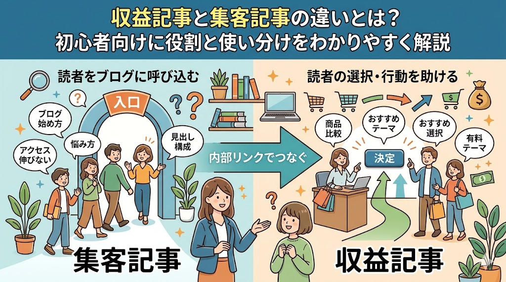 ブログで収益化を目指し始めると、「収益記事と集客記事は何が違うのか」と迷うことがあります。私自身も最初の頃は、とにかく収益につながりそうな記事を書けばよいと思っていました。ですが実際には、売り込みに近い記事だけを増やしても、アクセスが集まらず苦しくなりやすかったです。あとから分かったのは、ブログ全体には役割の違う記事が必要だということでした。この記事では、収益記事と集客記事の違い、初心者が意識したい使い分け方をやさしく整理していきます。
