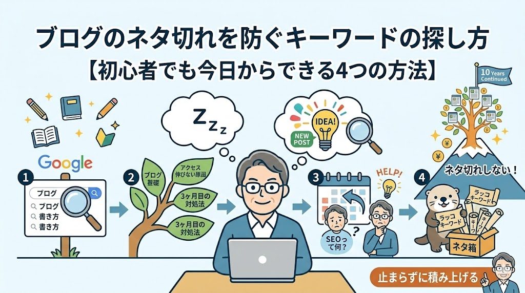 この記事では、私が10年間実践してきた「ネタ切れを防ぐキーワードの探し方」を4つの具体的な方法で紹介します。どれも特別なツールや知識は必要なく、今日から実践できます。ネタ探しで行き詰まっている方に、考え方を変えるきっかけとして読んでいただければ幸いです。