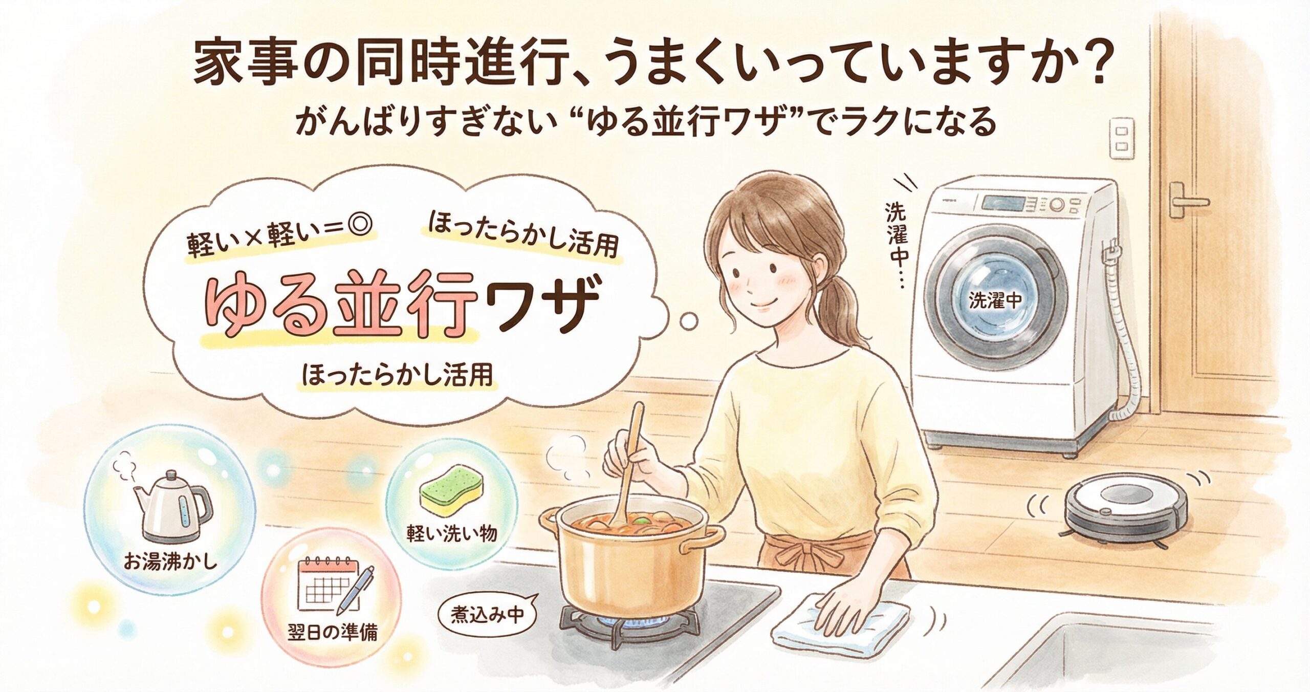 この中からどれか1つ取り入れるだけでも、家事の負担は確実に軽くなります。完璧なマルチタスクなんて必要ありません。大切なのは、“ゆるい並行”を味方につけること